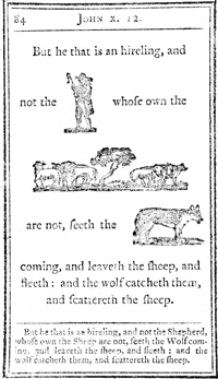 Description: Each page has illustrations to replace major topical items in the passage. In this case, a shepherd, flock, and wolf illustrate the parable of the Good Shepherd.