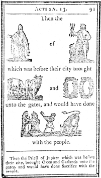 Description: Each page has illustrations to replace major topical items in the passage. In this case, bulls, garlands, a priest, Zeus, and a sacrifice scene illustrate the reaction to Paul and Barnabas's miracle.