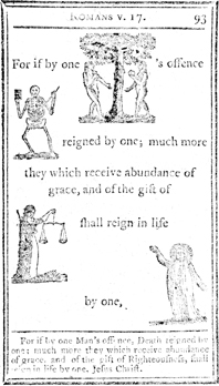 Description: Each page has illustrations to replace major topical items in the passage. In this case, Adam and Eve, Death, Lady Justice and Jesus illustrate death through sin and life through Christ.