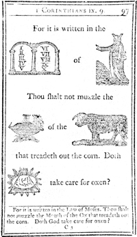 Description: Each page has illustrations to replace major topical items in the passage. In this case, the ten commandments, lips, a bull, and Moses illustrate issues of Apostleship.