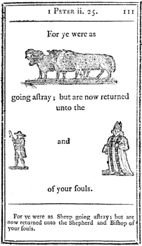 Description: Each page has illustrations to replace major topical items in the passage. In this case, sheep, a shepherd, and a bishop illustrate the return of the faithful.