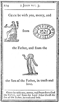 Description: Each page has illustrations to replace major topical items in the passage. In this case, the personification of peace, God and Jesus Christ illustrate the blessing invoked by 2 John.