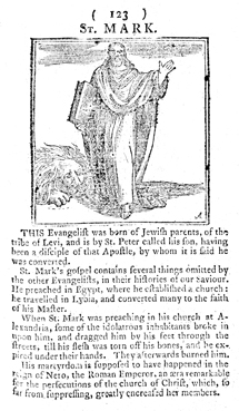 Description: An illustration of Saint Mark with a book and lion, his symbol.
