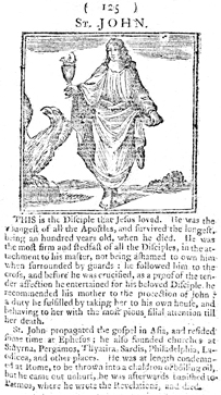 Description: An illustration of John holding a cup of flame, likely the cup of life or communion cup, with an eagle, his symbol, by his side.