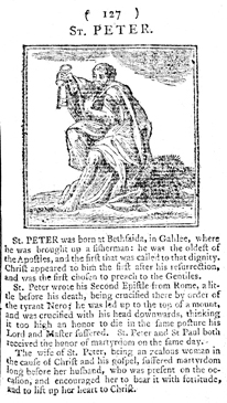 Description: An image of Saint Peter seated on an outcropping of rock, contemplating the keys.