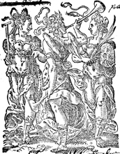 Description: One of the printer’s devices used by Sigmund Feyerabend (1528-1590) featuring the virtues of Fame (center) with Temperance (left, with bridle) and Peace (with beehive). Feyerabend was among the most accomplished printers in Frankfurt am Main, and this design was the work of Jost Amman.