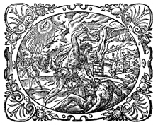 Description: Cain kills Abel with a jawbone after God accepts Abel’s generous sacrifice over Cain’s (foreground). Cain and Abel make their offerings (background).