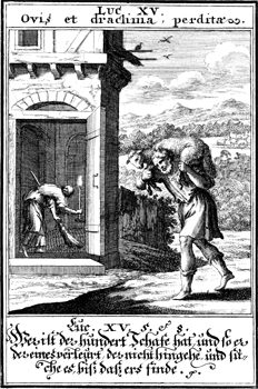 Description: A woman searches her house for a lost coin, while a shepherd brings a lost sheep home.
