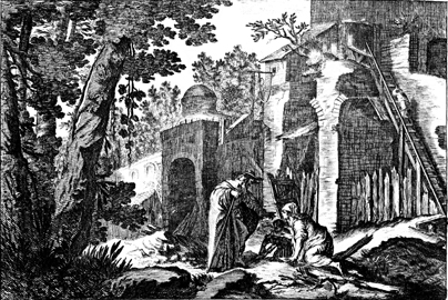 Description: Elijah meets the widow at Zarephath as she gathered sticks.