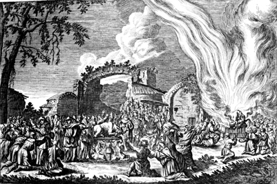 Description: God consumes Elijah's sacrifice with fire at Mt. Carmel, as King Ahab and the prophets of Baal look on.
