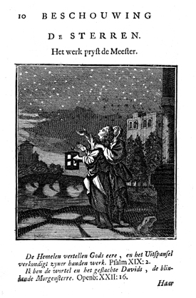 Description: In a city with a river flowing through it, a man and a woman, who holds a lantern, gaze at the star-studded night sky. The Dutch artist and poet Jan Luiken (1649-1712) was responsible for drawing this emblem and composed the poem that accompanies it. The etching was executed by Jan Luiken or his son Casper Luiken (1672-1708), who had used this image in an earlier work, which may be found in the Digital Image Archive under the call number 1699Weig. The attendant scriptures are Psalm 19:1 and Revelation 22:16.