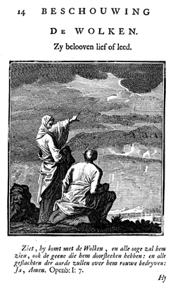 Description: A woman standing in the left foreground points to the clouds while a man sitting next to her listens to her. The Dutch artist and poet Jan Luiken (1649-1712) was responsible for drawing this emblem and composed the poem that accompanies it. The etching was executed by Jan Luiken or his son Casper Luiken (1672-1708), who had used this image in an earlier work, which may be found in the Digital Image Archive under the call number 1699Weig. The attendant scripture text is Revelation 1:7.