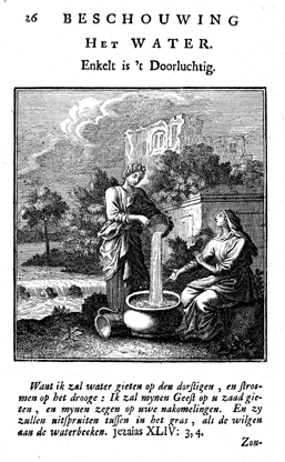 Description: A standing woman pours water from a small container into a large one on the ground; a second woman sitting next to her comments on the transparency of the stream as the water is being poured. In the background is a river. The Dutch artist and poet Jan Luiken (1649-1712) was responsible for drawing this emblem and composed the poem that accompanies it. The etching was executed by Jan Luiken or his son Casper Luiken (1672-1708), who had used this image in an earlier work, which may be found in the Digital Image Archive under the call number 1699Weig. The attendant scripture text is Isaiah 44:3–4.