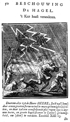 Description: Several people and a dog try to protect themselves from being hit by large hailstones during a violent thunderstorm. The Dutch artist and poet Jan Luiken (1649-1712) was responsible for drawing this emblem and composed the poem that accompanies it. The etching was executed by Jan Luiken or his son Casper Luiken (1672-1708), who had used this image in an earlier work, which may be found in the Digital Image Archive under the call number 1699Weig. The attendant scripture text is Ezekiel 13:13.