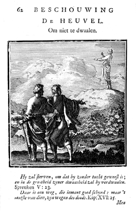Description: In a valley, two hikers point to a man standing on a hill from which he surveys his surroundings. The Dutch artist and poet Jan Luiken (1649-1712) was responsible for drawing this emblem and composed the poem that accompanies it. The etching was executed by Jan Luiken or his son Casper Luiken (1672-1708), who had used this image in an earlier work, which may be found in the Digital Image Archive under the call number 1699Weig. The attendant scriptures are Proverbs 5:23 and Proverbs 16:25.