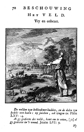 Description: A man looks at a landscape consisting of a ditch with ducks, a large meadow with sheep and cows, and a village in the background. The Dutch artist and poet Jan Luiken (1649-1712) was responsible for drawing this emblem and composed the poem that accompanies it. The etching was executed by Jan Luiken or his son Casper Luiken (1672-1708), who had used this image in an earlier work, which may be found in the Digital Image Archive under the call number 1699Weig. The attendant scriptures are Psalm 65:13 and Isaiah 56:9.