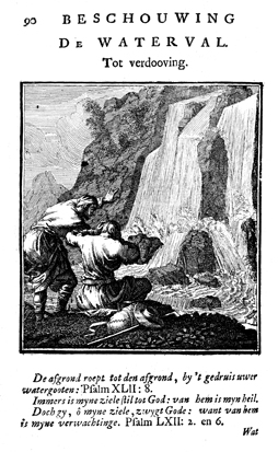 Description: Two travelers are in front of a huge waterfall. One points to the waterfall, the other tries to protect his hears from the noise. The Dutch artist and poet Jan Luiken (1649–1712) was responsible for drawing this emblem and composed the poem that accompanies it. The etching was executed by Jan Luiken or his son Casper Luiken (1672–1708), who had used this image in an earlier work, which may be found in the Digital Image Archive under the call number 1699Weig. The attendant scriptures are Psalm 42:7 and Psalm 62:1, 5.