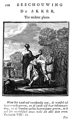 Description: Two women cut the stalks of grain; behind them two men bind the sheaves, and someone plows in the distance. The Dutch artist and poet Jan Luiken (1649–1712) was responsible for drawing this emblem and composed the poem that accompanies it. The etching was executed by Jan Luiken or his son Casper Luiken (1672–1708), who had used this image in an earlier work, which may be found in the Digital Image Archive under the call number 1699Weig. The attendant scripture text is Zechariah 8:12.