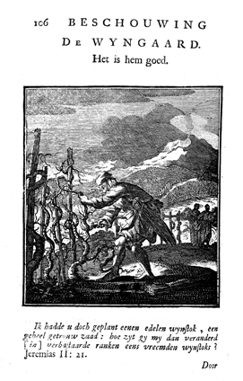 Description: In a vineyard a worker is in the process of pruning shoots. The Dutch artist and poet Jan Luiken (1649–1712) was responsible for drawing this emblem and composed the poem that accompanies it. The etching was executed by Jan Luiken or his son Casper Luiken (1672–1708), who had used this image in an earlier work, which may be found in the Digital Image Archive under the call number 1699Weig. The attendant scripture text is Jeremiah 2:21.