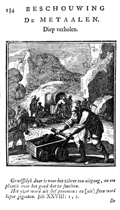 Description: Several miners are at work around a mineshaft set in a mountain: two operate a windlass at the entrance of the mineshaft, one pushes a wagon with ore and a few work at a smelting oven. The Dutch artist and poet Jan Luiken (1649–1712) was responsible for drawing this emblem and composed the poem that accompanies it. The etching was executed by Jan Luiken or his son Casper Luiken (1672–1708), who had used this image in an earlier work, which may be found in the Digital Image Archive under the call number 1699Weig. The attendant scripture text is Job 28:1-2.