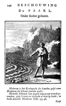 Description: A man walks along the beach and point to the shells that landed on the beach with the tide. The Dutch artist and poet Jan Luiken (1649–1712) was responsible for drawing this emblem and composed the poem that accompanies it. The etching was executed by Jan Luiken or his son Casper Luiken (1672-1708), who had used this image in an earlier work, which may be found in the Digital Image Archive under the call number 1699Weig. The attendant scripture text is Matthew 13:45-46.