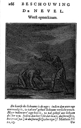 Description: Two men carefully try to find their way in a heavy fog. The Dutch artist and poet Jan Luiken (1649–1712) was responsible for drawing this emblem and composed the poem that accompanies it. The etching was executed by Jan Luiken or his son Casper Luiken (1672-1708), who had used this image in an earlier work, which may be found in the Digital Image Archive under the call number 1699Weig. The attendant scripture text is Matthew 6:22-23.