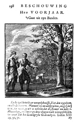 Description: In a garden an older man shows a young man the young plants that have sprung up in a bed under a tree. A number of gardeners are at work in the background. The Dutch artist and poet Jan Luiken (1649–1712) was responsible for drawing this emblem and composed the poem that accompanies it. The etching was executed by Jan Luiken or his son Casper Luiken (1672-1708), who used this image in an earlier work, which may be found in the Digital Image Archive under the call number 1699Weig. The attendant scripture text is Luke 21:29-31.