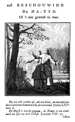 Description: In a garden a man and a woman point to a tree that has nearly lost all its leaves; in the background are other bare trees and a man with a wheelbarrow. The Dutch artist and poet Jan Luiken (1649–1712) was responsible for drawing this emblem and composed the poem that accompanies it. The etching was executed by Jan Luiken or his son Casper Luiken (1672-1708), who had used this image in an earlier work, which may be found in the Digital Image Archive under the call number 1699Weig. The attendant scriptures are Isaiah 64:6 and Jeremiah 8:20.