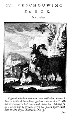 Description: A he-goat and a she-goat, in the foreground of the image, stand next to a rocky outcropping; in the background a shepherd and a helper are herding their flock. The Dutch artist and poet Jan Luiken (1649–1712) was responsible for drawing this emblem and composed the poem that accompanies it. The etching was executed by Jan Luiken or his son Casper Luiken (1672–1708) who adapted this image from one used in an earlier work, which may be found in the Digital Image Archive under the call number 1699Weig. The attendant scripture text is Zechariah 10:3.