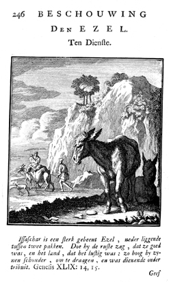 Description: In the right foreground, one donkey is standing and one is lying down. In the distance two donkeys are being driven alongside a steep cliff; one is carrying a woman and child, the other carries two sacks. The Dutch artist and poet Jan Luiken (1649–1712) was responsible for drawing this emblem and composed the poem that accompanies it. The etching was executed by Jan Luiken or his son Casper Luiken (1672–1708) who adapted this image from one used in an earlier work, which may be found in the Digital Image Archive under the call number 1699Weig. The attendant scripture text is Genesis 49:14-15.