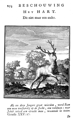Description: A deer is being chased by a hunter on his horse and his three dogs. The Dutch artist and poet Jan Luiken (1649–1712) was responsible for drawing this emblem and composed the poem that accompanies it. The etching was executed by Jan Luiken or his son Casper Luiken (1672–1708) who adapted this image from one used in an earlier work, which may be found in the Digital Image Archive under the call number 1699Weig. The attendant scripture text is Genesis 25:27.