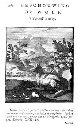 Description: A wolf, with a skeleton next to it, lies in the foreground. In the distance, a shepherd herds his flock of sheep. The Dutch artist and poet Jan Luiken (1649–1712) was responsible for drawing this emblem and composed the poem that accompanies it. The etching was executed by Jan Luiken or his son Casper Luiken (1672–1708) who adapted this image from one used in an earlier work, which may be found in the Digital Image Archive under the call number 1699Weig. The attendant scripture text is Ezekiel 22:27.