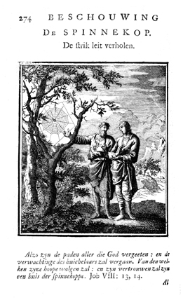 Description: Two men look at a large spider web that a spider has spun between the branches of a tree. The Dutch artist and poet Jan Luiken (1649–1712) was responsible for drawing this emblem and composed the poem that accompanies it. The etching was executed by Jan Luiken or his son Casper Luiken (1672–1708) who adapted this image from one used in an earlier work, which may be found in the Digital Image Archive under the call number 1699Weig. The attendant scripture text is Job 8:13-14.