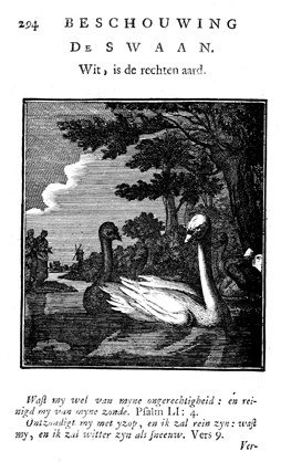 Description: A man and a woman look at a white swan and its reflection in the water and two young grey swans; several other swans can be seen under the trees. The Dutch artist and poet Jan Luiken (1649–1712) was responsible for drawing this emblem and composed the poem that accompanies it. The etching was executed by Jan Luiken or his son Casper Luiken (1672–1708) who adapted this image from one used in an earlier work, which may be found in the Digital Image Archive under the call number 1699Weig. The attendant scripture text is Psalm 51:2, 7.