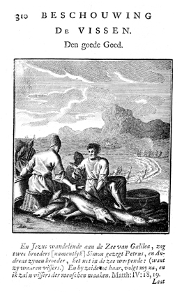 Description: On the beach, two fishermen sort their catch; behind them is a man with a large basket. In the background a large number of fishermen pull in a huge net. The Dutch artist and poet Jan Luiken (1649–1712) was responsible for drawing this emblem and composed the poem that accompanies it. The etching was executed by Jan Luiken or his son Casper Luiken (1672–1708) who adapted this image from one used in an earlier work, which may be found in the Digital Image Archive under the call number 1699Weig. The attendant scripture text is Matthew 4:18-19.