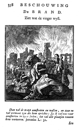 Description: People flee with their families and their belongings from the burning houses in the background. The Dutch artist and poet Jan Luiken (1649–1712) was responsible for drawing this emblem and composed the poem that accompanies it. The etching was executed by Jan Luiken or his son Casper Luiken (1672–1708) who adapted this image from one used in an earlier work, which may be found in the Digital Image Archive under the call number 1699Weig. The attendant scripture text is Jeremiah 50:32.