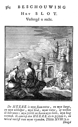 Description: Two men seated in the foreground view a huge, beautifully and strongly built castle that is outfitted with numerous towers and a large, closed gate. The Dutch artist and poet Jan Luiken (1649–1712) was responsible for drawing this emblem and composed the poem that accompanies it. The etching was executed by Jan Luiken or his son Casper Luiken (1672–1708) who adapted this image from one used in an earlier work, which may be found in the Digital Image Archive under the call number 1699Weig. The attendant scripture text is Psalm 18:2-3.