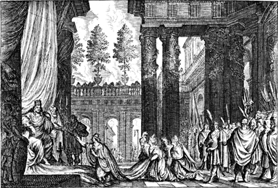 Description: Esther kneels before King Xerxes to make her request. Haman hangs on the gallows in the background.
