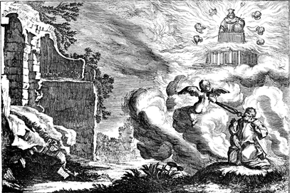 Description: Isaiah's vision of the heavenly throne room above the temple of Jerusalem. An angel touches a hot coal to Isaiah's lips with a pair of tongs.