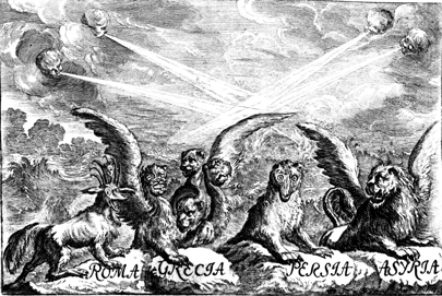 Description: As the four winds blow upon the waters, out of the sea emerge four beasts: one with the head of a lion and wings of the eagle; a second was in the form of a bear and had three ribs in its mouth; the third beast had four heads and four wings; and the fourth beast had long teeth, multiple horns, and hooves like those of an ox. The image indicates different countries bellow each beast to represent the four kings that will arise from the earth.