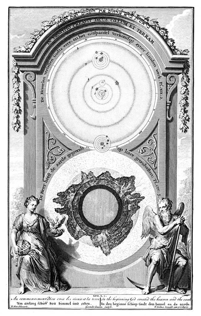 Description: Diagram of the solar system and earth. Engraving by Francois Halma from the design of Gerard Hoet (1648–1733).