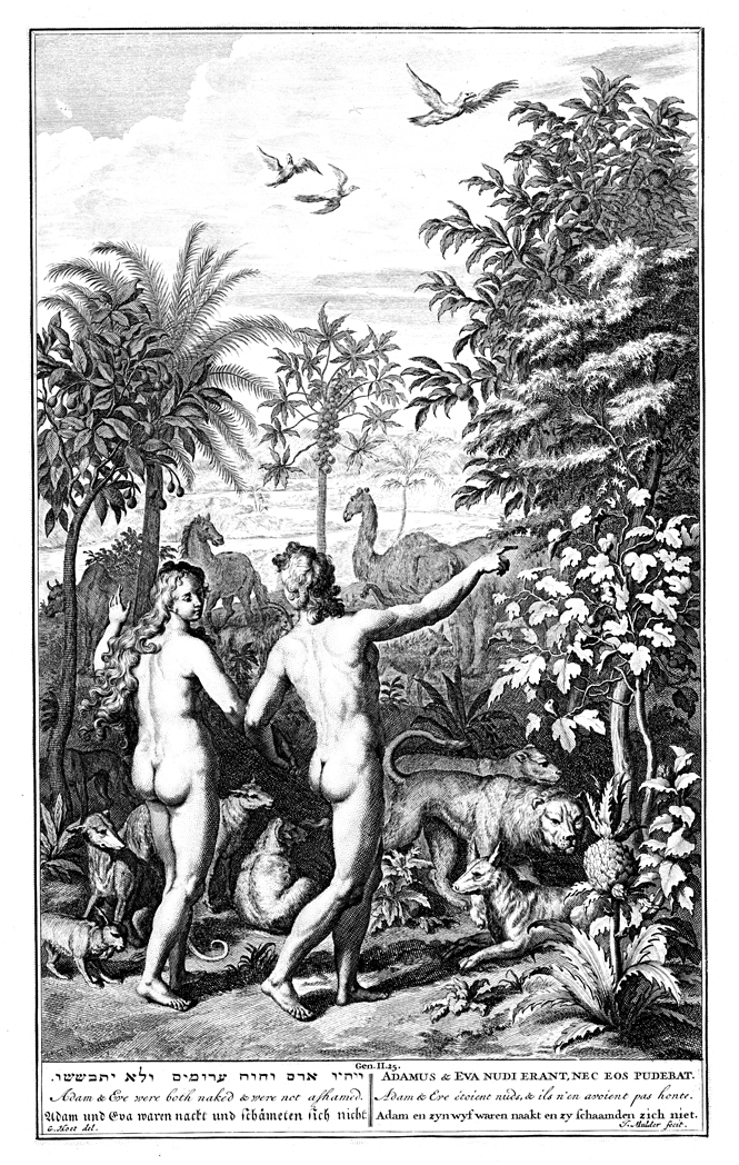 Description: Adam shows Eve the garden and animals. Engraving by Joseph Mulder (1658 - ca. 1728) from the design of Gerard Hoet (1648–1733) .