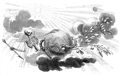 Description: A tailpiece depicting Death, a skeleton grasping an arrow, and Sin, in the form of a snake grasping a fruit, surrounding a globe. Created by Bernard Picart (1673-1733).