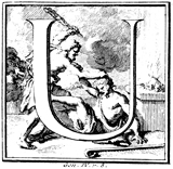 Description: An initial letter U depicting Cain poised to strike Abel, while a lamb burns on his altar and the smoke rises to the sky. Cain’s offering lies unburnt on another altar. Created by Bernard Picart (1673-1733).