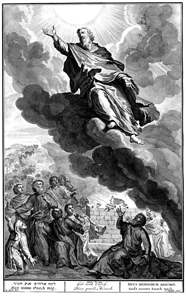 Description: God takes Enoch while crowds watch in awe. Engraving by Joseph Mulder (1658 - ca. 1728) from the design of Gerard Hoet (1648–1733).