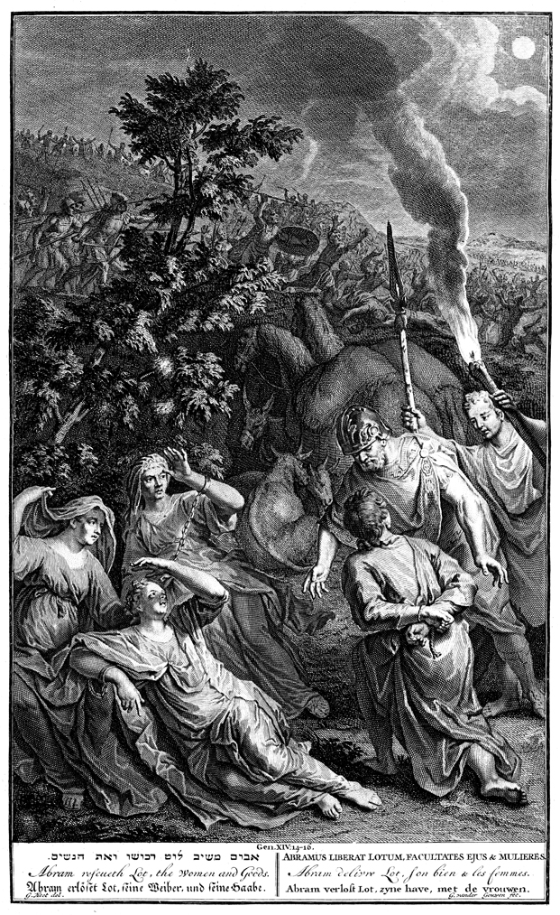 Description: Abram rescues Lot and several women while battle rages in the background. Engraving by G. vander Gouwen from the design of Gerard Hoet (1648–1733).
