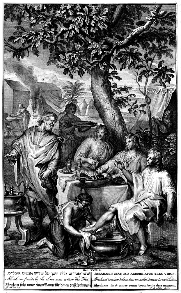 Description: Abraham washes the feet of three men under the tree as they sit before a table. Sarah observes them from a nearby tent. Engraved by Jan de Later from the design of Gerard Hoet (1648–1733).