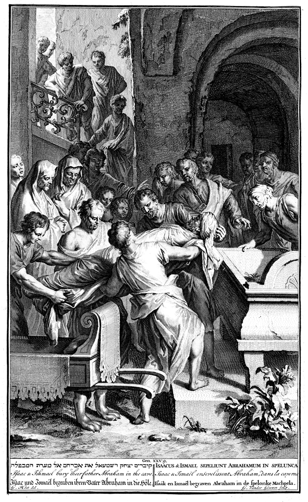 Description: Isaac, Ishmael and mourners bury Abraham in a coffin. Engraved by G. vander Gouwen from the design of Gerard Hoet (1648–1733).