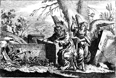 Description: Matthew, the Evangelist, listens carefully as an angel brings to him the gospel he was to write.
