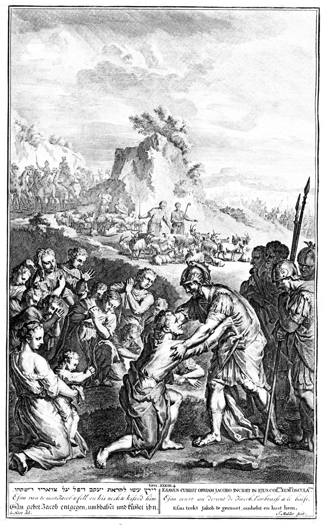 Description: Jacob and Esau meet and embrace. Engraved by Joseph Mulder (1658 - ca. 1728) from the design of Gerard Hoet (1648–1733).